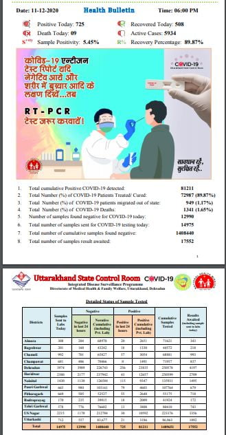 शाम छह बजे जारी किए गए हेल्थ बुलेटिन के अनुसार विभिन्न अस्पतालों से 508 लोग कोरोना संक्रमण मुक्त होकर अपने घरों को लौटे। राज्य में अब तक 72987 लोग कोरोना की जंग जीतकर संक्रमण मुक्त हुए हैं। राज्य के लिए चिंता की एक बात और है कि उत्तराखंड का रिकवरी रेट 90 प्रतिशत से नीचे लुढ़क कर 89.87 प्रतिशत हो गया है। 5934 एक्टिव मरीज राज्य में इस समय इलाज करा रहे हैं। 17552 सैंपल विभिन्न लैब में जांच रिपोर्ट आने का इंतजार कर रहे हैं।