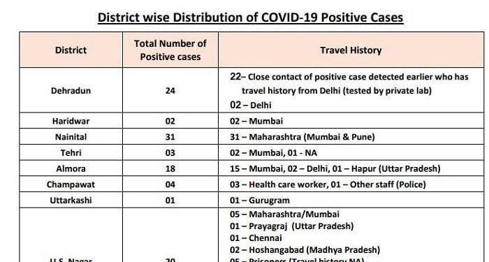 नैनीताल में सबसे अधिक 31 लोग संक्रमित हुए हैं, जो महाराष्ट के मुंबई तथा पुणे से लौटे हैं। टिहरी में 3 लोग संक्रमित हुए हैं, 2 मुंबई से लौटे हैं, जबकि एक का यात्रा विवरण उपलब्ध नहीं है। अल्मोड़ा में 18 लोग संक्रमित हुए हैं। 15 मुंबई से 2 दिल्ली से, एक हापुड़ उत्तर प्रदेश से लौटा है। चंपावत जिले में 4 संक्रमित हुए हैं, तीन स्वास्थ्य कर्मी हैं, एक पुलिस कर्मी है। उत्तरकाशी में एक व्यक्ति संक्रमित हुआ है, जो गुरुग्राम से लौटा है।