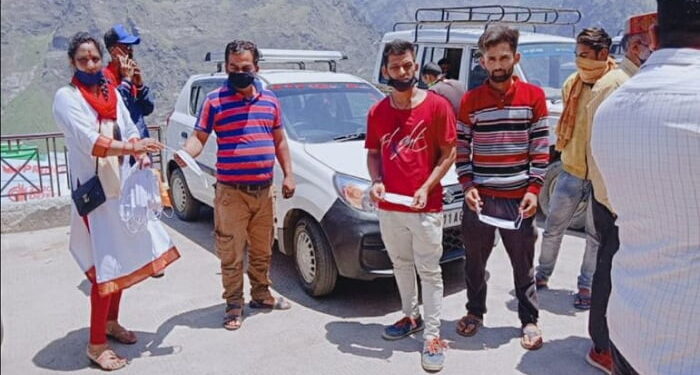 फोटो– जोशीमठ टेैक्सी स्टैण्ड पर मास्क वितरित करती पूर्व सभासद ललिता देवी ।