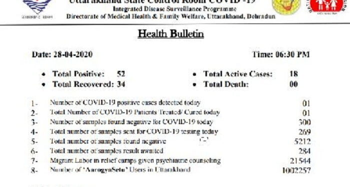 उत्तराखंड राज्य नियंत्रण कक्ष कोविड-19 से प्राप्त सूचना के अनुसार 28 अप्रैल शाम छह बजे तक कुल पाजिटिव की संख्या 52 है, जिसमें से 34 स्वस्थ होकर अपने घर जा चुके हैं, एक्टिव कोविड-19 पाजिटिव 18 हैं। आज एक कोरोना पाजिटिव चिन्हित हुआ तो एक कोरोना पीड़ित स्वस्थ होकर डिस्चार्ज हुआ।