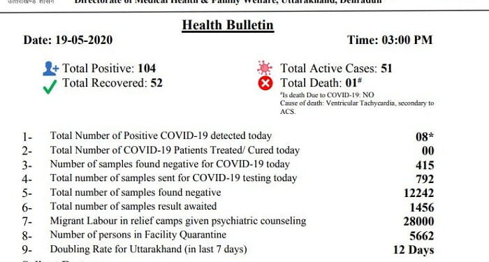प्रदेश नियंत्रण कक्ष कोविड-19 से प्राप्त रिपोर्ट के अनुसार कल उत्तरकाशी का एक युवक ऋषिकेश एम्स से प्राप्त रिपोर्ट के अनुसार कोरोना पाजिटिव चिन्हित किया गया था। यह मामला देहरादून जिले में माना गया।