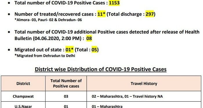 रिपोर्ट के अनुसार चंपावत जिले में तीन पाजिटिव मिले है, दो महाराष्ट से आए हैं, जबकि एक का यात्रा इतिहास ज्ञात नहीं है। उधमसिंह नगर में एक कोरोना पाजिटिव मिला है, जो महाराष्ट से लौटा है। बागेश्वर जिले में दो संक्रमित मिले हैं, एक मुंबई तथा दूसरा गुजरात से आया है। अल्मोड़ा में एक संक्रमित चिन्हित किया गया है, जो दिल्ली एनसीआर से लौटा है। देहरादून में एक पाजिटिव मिला है, जो निरंजनपुर सब्जी मंडी से चिन्हित किया है।
