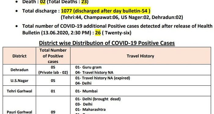 टिहरी जिले में एक संक्रमित हुआ है, जो मुंबई से आया है। पौड़ी जिले में 9 लोग संक्रमित हुए हैं। एक दिल्ली से आया है, उसकी मौत हो गई है। तीन दिल्ली से आए हैं, एक महाराष्ट से, एक गुरुग्राम से, एक फरीदाबा से आया है, जबकि दो का यात्रा इतिहास ज्ञात नहीं है। हरिद्वार में चार लोग आए हैं, चारों दिल्ली से आए हैं। उत्तरकाशी में दो लोग संक्रमित हुए हैं, दोनों मुंबई से आए हैं। आ दो लोगों की मृत्यु हुई है, कुल 23 लोग कोरोना से मारे गए हैं।