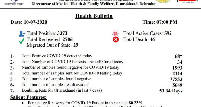 राज्य नियंत्रण कक्ष कोविड-19 द्वारा शाम 7 बजे जारी किए गए हेल्थ बुलेटिन के अनुसार आज 34 लोग विभिन्न जिलों के अस्पतालों से स्वस्थ होकर अपने घरों को लौटे। जिनमें बागेश्वर 7, देहरादून 21, पौड़ी 1, उधमसिंहन नगर 5 शामिल हैं। आज बागेश्वर जिला एक्टिव कोरोना पाजिटिव के मामले में शून्य हो गया। रुद्रप्रयाग जिला कई दिनों से शून्य में चल रहा है।