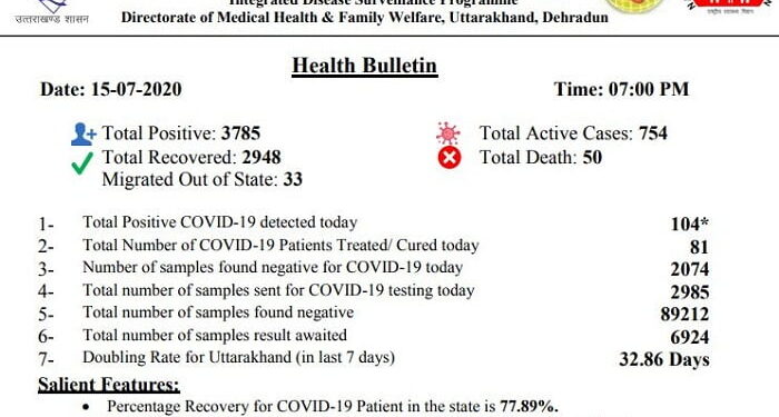 देहरादून। राज्य में आज एक दिन में सौ से अधिक 104 कोरोना संक्रमित चिन्हित किए गए। राज्य का आंकड़ा 3785 पहुंच गया है। राज्य में लगातार एक्टिव मामले बढ़ रहे हैं, अब ये 754 पहुंच गए हैं।