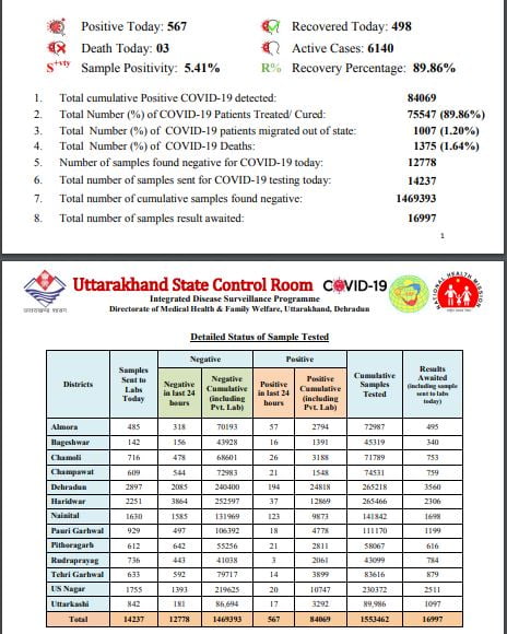 देहरादून। राज्य में आज 567 कोरोना संक्रमित चिन्हित किए गए। इसके चलते संक्रमितों का आंकड़ा 84069 पहुंच गया है। राज्य में आज तीन लोगों की कोरोना से मौत हुई, अब तक राज्य में 1375 लोग कोरोना की भेंट चढ़ गए हैं।