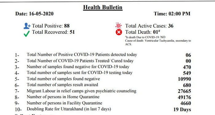पिछले दिनों से लगातार हर रोज बड़ी संख्या में कोरोना पाजिटिव चिन्हित होने से राज्य का आकड़ा ही बदल गया है। 88 कोरोना पाजिटिव में से 51 ठीक होकर घर जा चुके हैं। 36 एक्टिव पाजिटिव हैं, जो इलाज करा रहे हैं। एक की कोरोना से मृत्यु हुई है। लगातार कोरोना पाजिटिव बढ़ने की वजह से डबलिंग रेट 19 दिन हो गया है, जो एक समय 56 दिन तक पहुंच गया था।