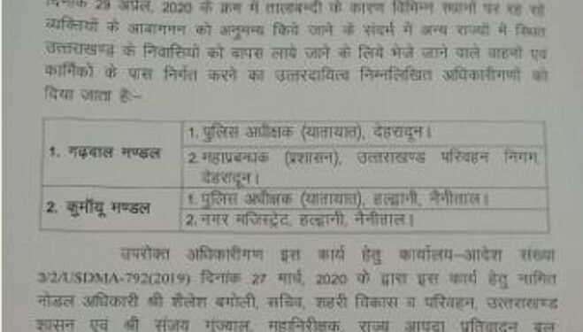 देहरादून। भारत सरकार के गृह मंत्रालय के निर्देशानुसार लाकडाउन की वजह से विभिन्न स्थानों पर फंसे उत्तराखंड के निवासियों को वापस लाने के लिए भेजे जाने वाले वाहनों एवं कार्मिकों के पास निर्गत करने का उत्तरदायित्व अधिकारियों को सौंपा गया है। सचिव शहरी विकास एवं परिवहन शैलेश बगोली आईजी संजय गुंज्याल को नोडल अधिकारी नामित किया गया है।