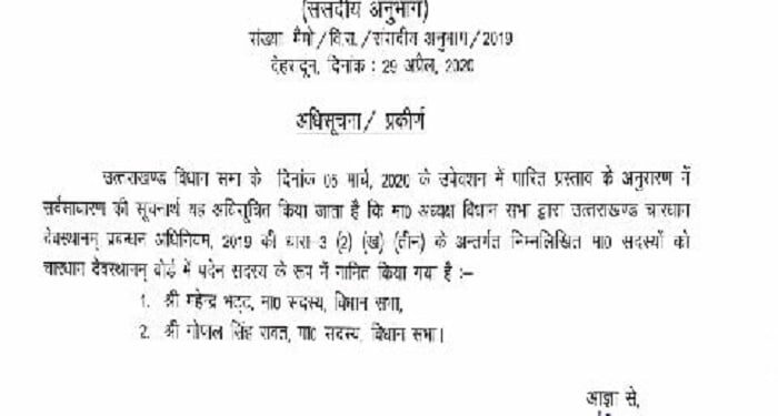 सचिव विधानसभा द्वारा जारी अधिसूचना जगदीश चंद्र ने इस संबंध अधिसूचना जारी की है। गौरतलब है कि 29 फरवरी 2020 को बोर्ड का विधिवत गठन किया गया था। गढ़वाल कमिश्नर रविनाथ रमन को बोर्ड का सीईओ नियुक्त किया गया था। इसी दिन उन्होंने कार्यभार संभाला था। उसके बाद बोर्ड के गठन का इंतजार किया जा रहा था, जो अब किया गया है।