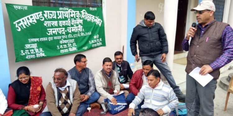 मंगलवार को उप शिक्षा अधिकारी के कार्यालय के बाहर शिक्षक धरना पर बैठे रहे। इस दौरान ब्लाक अध्यक्ष मोहन सिंह रावत और जिला अध्यक्ष दिगंबर सिंह नेगी ने कहा कि नई पेंशन योजना के तहत कर्मचारियों को सरकारी कंपनियों में निवेश करना पड़ता है जिसके बाद वह एक लाख के निवेश पर 545 से 600 रूपये तक की दर से पेंशन भुगतान किये जाने का प्राविधान किया गया है।