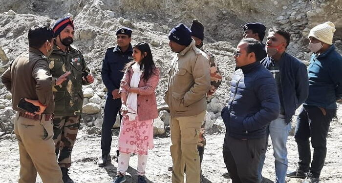 फोटो1.रैणी साइड पर राहत एवं वैली ब्रिज निर्माण कार्यों का निरीक्षण करते डी एम व अन्य अधिकारी।