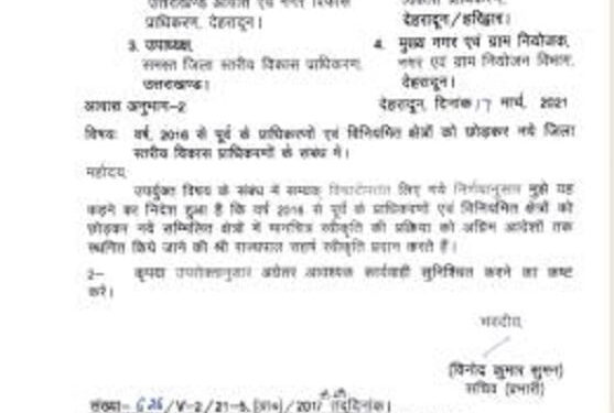 प्रभारी सचिव विनोद कुमार सुमन ने मुख्य प्रशासक उत्तराखंड आवास एवं नगर विकास प्राधिकरण देहरादून, उपाध्यक्ष विकास प्राधिकरण देहरादून/हरिद्वार, उपाध्यक्ष समस्त जिला विकास प्राधिकरण उत्तराखंड, मुख्य नगर एवं विकास नियोजक, नगर एवं ग्राम नियोजन विभाग देहरादून को लिखे पत्र में कहा है कि सन् 2016 से पूर्व के प्राधिकरणों एवं विनियमित क्षेत्रों मानचित्र स्वीकृति की प्रक्रिया को अगले आदेशों तक स्थगित किया जा रहा है।