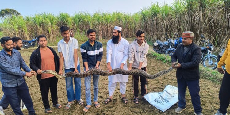डोईवाला, (प्रियांशु सक्सेना)। नगर पालिका क्षेत्र के हँसूवाला में शुक्रवार को एक 15 फीट लंबा विशाल अजगर मिलने से क्षेत्र में हड़कंप मच गया। प्राप्त जानकारी के अनुसार घास काटने गए किसानों ने कब्रिस्तान के समीप धूप में बैठे अजगर को देखा। किसानों की आवाज सुनते ही अजगर सरकते हुए भागने लगा, जिसके चलते मौके पर अफरा-तफरी की स्थिति बन गई। किसानों ने तत्काल घटना की सूचना सामाजिक कार्यकर्ता अधिवक्ता साकिर हुसैन को दी। उन्होंने बिना देरी किए सर्प मित्र भारत भूषण पेले को जानकारी उपलब्ध कराई। सूचना मिलने पर सर्प मित्र मौके पर पहुंचे और स्थानीय लोगों की मदद से अजगर को सुरक्षित रूप से पकड़ लिया गया, अजगर को पकड़ने के बाद उसे जंगल में सुरक्षित रूप से छोड़ दिया गया।