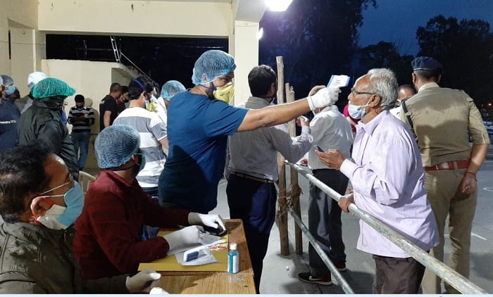 - गौचर में थर्मल चेकिंग करते स्वास्थ कर्मी।