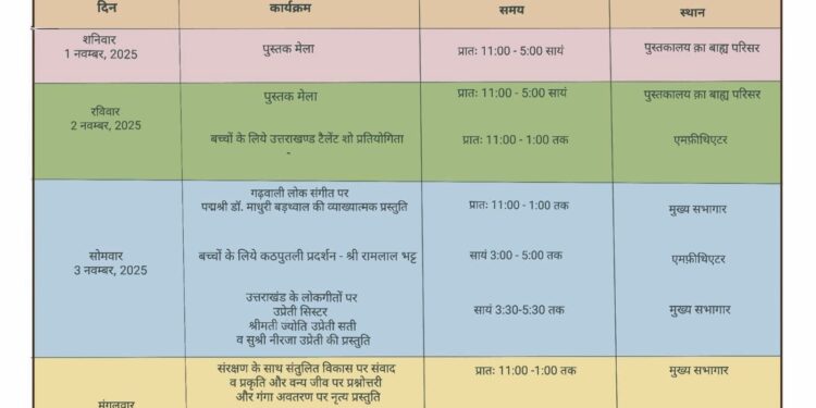 आयोजित कार्यक्रमों पर जारी प्रेस विज्ञप्ति में दून पुस्तकालय एवं शोध केन्द्र के अध्यक्ष प्रो. बी.के जोशी, मानद निदेशक श्री एन रवि शंकर और कार्यक्रम के मुख्य संयोजक श्री एन एस नपलच्याल, संयोजक श्री अनिल रतूड़ी, पूर्व पुलिस महानिदेशक, उत्तराखण्ड व श्री जय राज पूर्व मुख्य वन संरक्षक ने संयुक्त रूप से बताया कि शनिवार,1 नवम्बर, 2025 को पुस्तकालय परिसर में इस पुस्तक मेला का उद्घाटन उत्तराखण्ड के मुख्य सचिव श्री आनंद बर्धन द्वारा किया जायेगा। यह पुस्तक मेला अगले दिन 2 नवम्बर,2025 तक प्रातः 11:00 – सांय 5: 00 बजे तक आम जनों के लिए निशुल्क खुला रहेगा। दून पुस्तकालय एवं शोध केन्द्र के बाह्य परिसर में चलने वाले इस पुस्तक मेले में प्रमुख रूप से हिमालय व उत्तराखण्ड पर आधारित पुस्तकें विक्रय के लिए उपलब्ध रहेंगी। इसमें आम जन को समाज,मानविकी, इतिहास, अर्थशास्त्र, पर्यावरण, भूगोल, संस्कृति, कथा, उपन्यास, संस्मरण, भाषा व साहित्यिक तथा अन्य विषयक पुस्तकें खरीदने का अवसर मिल सकेगा। देहरादून शहर, राज्य और दिल्ली के 18 प्रकाशकों की भागीदारी इस पुस्तक मेले में रहेगी। पुस्तक मेला के स्टॉलों में बाल साहित्य भी उपलब्ध रहेगा। प्रकाशकों व वितरकों की ओर से संस्थागत पुस्तकालयों व आम लोगों को पुस्तक खरीद में आकर्षक छूट भी प्रदान की जायेगी।