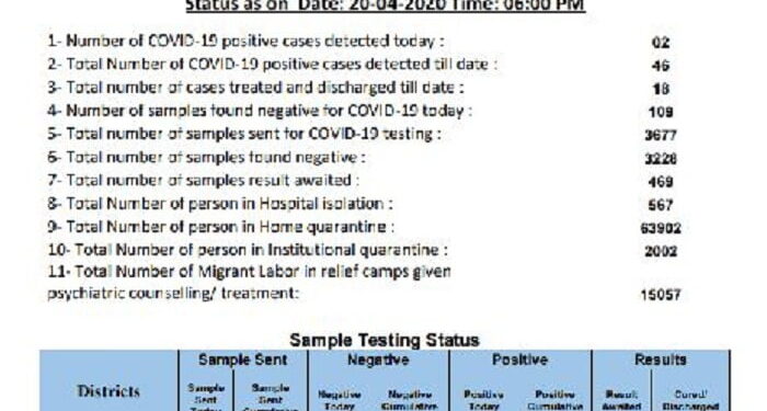 इन्हें दून मेडिकल कॉलेज अस्पताल के आइसोलेशन वॉर्ड में भर्ती कराया गया है। इनके संपर्क में आए लोगों को स्वास्थ्य विभाग, पुलिस की टीमें चिह्नित कर रही हैं। प्रदेश में अभी तक 3677 सैंपल जांच के लिए भेजे गए हैं, जिनमें 3228 की रिपोर्ट निगेटिव और 46 की पॉजिटिव आई है। वहीं, 469 सैंपल की रिपोर्ट अभी नहीं आई है। वर्तमान में प्रदेश में 28 एक्टिव केस हैं।