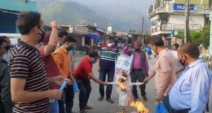 गैरसैंण । गलवान में चीन के कायराना हरकतों से भारत का आम नागरिक गुस्साया हुआ है इसी परिपेक्ष में गैरसैंण नगर में व्यापारियों और जन प्रतिनिधियों ने दो मिनट का मौन रख कर गलवान में शहीद हुए भारत के 20 वीर जवानों को श्रृद्धांजली अर्पित की । आक्रोषित लोगों ने मुख्य चैराहे पर चीन के खिलाप जमकर नारेबाजी करते हुए चीनी शासक जिनपिंग का पुतला दहन किया। प्रदर्शन कारी व्यापारियों और जन प्रतिनिधियों सामाजिक कार्यकर्ताओं ने चीन निर्मित सामान को न खरीदने और न बेचने का संकल्प लिया । पूर्व राज्य मंत्री सुरेश कुमार बिष्ट ने कहा कि धोखे बाज चीन को भारत की सैना सबक सिखायेगी वीर शहीद जवानों की शहादत को बेकार नहीं जाने दिया जायेगा। पूरा देश भारतीय सैनिकों के शौर्य और वलिदान का सम्मान करते हुए सैना के साथ खड़ा है। इस दौरान कांग्रेस के ब्लाॅक अध्यक्ष के एस बिष्ट, कांग्रेस जिला मंत्री पूरन सिंह नेगी, महिला अध्यक्ष कृष्णा नेगी, नंदन सिंह ,महावीर कंडारी , ललित नारायण साह, कुलदीप बिष्ट, विरेंद्र पंवार ,सभासद दिनेश ढौंडियाल और मोहन टमटा आदि मौजूद रहे।