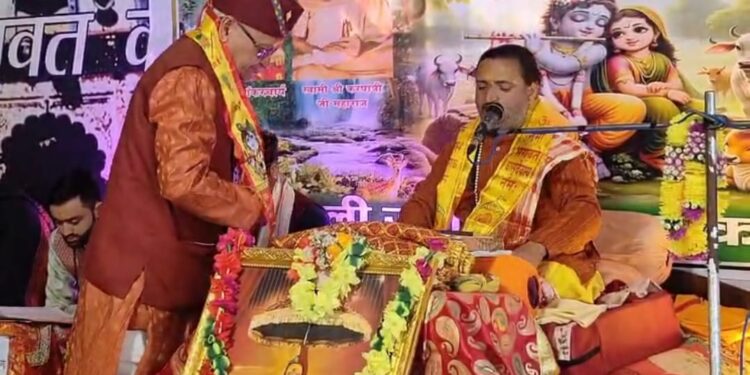 कथा के तीसरे दिवस श्री बद्रीनाथ केदारनाथ मंदिर समिति के पूर्व सदस्य हरीश डिमरी ने ब्यास पीठ पर कथा ब्यास पंडित नीरज शास्त्री का सम्मान किया।