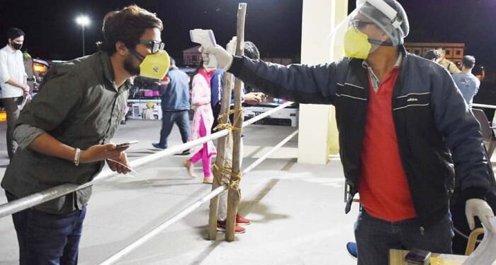 फोटो…बाहरी प्रदेशों से गौचर पुहंचे लोगों की थर्मल चेकिंग करते हुए।