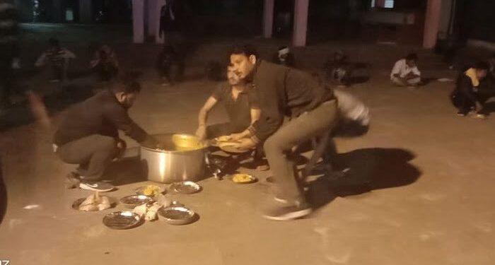 फ़ोटोः पैदल ही अपने घरों की ओर लौट रहे मजदूरों को गौचर मे भोजन कराते हुए