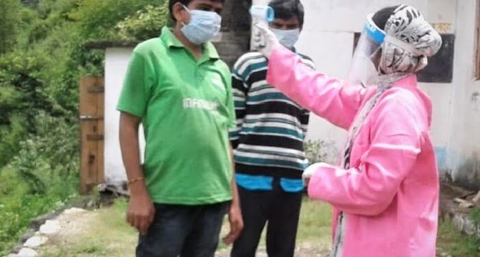 फोटो- क्वारेंटिंन किये गए लोगों का स्वास्थ्य परीक्षण करती आशा कार्यकर्ती।