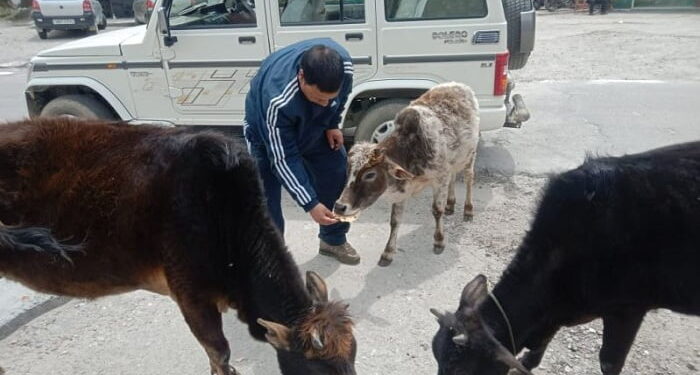 फोटो…नगर पालिका जोशीमठ के ई ओ एस पी नौटियाल द्वारा पशुओं को नियमित चारा दिया जा रहा है।