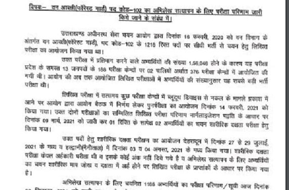 अधीनस्थ सेवा चयन आयोग के सचिव संतोष बडोनी ने यहां जारी एक विज्ञप्ति में कहा है कि आयोग ने 16 फरवरी 2020 को यह परीक्षा आयोजित की थी। फारेस्ट गार्ड के 1218 रिक्त पदों को भरने के लिए यह परीक्षा आयोजित की गई थी। उक्त परीक्षा में 156046 अभ्यर्थियों ने हिस्सा लिया था, इस हिसाब से यह अब तक की सबसे बड़ी परीक्षा थी। 13 जिलों के 188 परीक्षा केंद्रों पर यह परीक्षा आयोजित की गई थी।