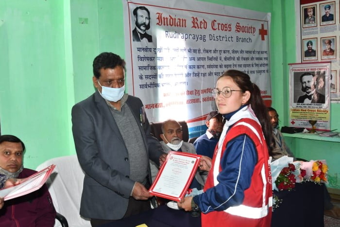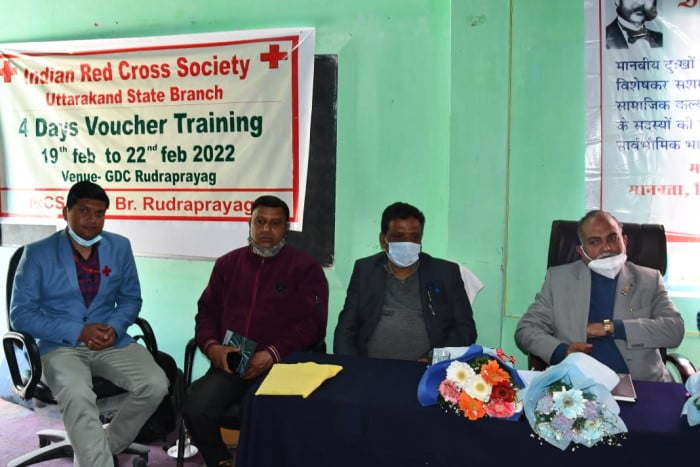 भारतीय रेडक्रॉस समिति राज्य शाखा उत्तराखंड के तत्वावधान में भारतीय रेडक्रॉस समिति रुद्रप्रयाग द्वारा जनपद में 04 दिवसीय रेडक्रॉस वाउचर प्रशिक्षण के अंतिम दिवस के अवसर पर राज्य प्रतिनिधि मुंशी चैमवाल, तहसील प्रभारी देवेन्द्र खत्री एवं मास्टर ट्रेनर राजवेन्द्र रावत द्वारा मुख्य अतिथि डॉ एमएस अंसारी अवैतनिक महासचिव, विशिष्ठ अतिथि डॉ बीके शुक्ला, प्राचार्य डॉ जगमोहन रावत, अनूप सेमवाल, कोषाध्यक्ष रेडक्रॉस रुद्रप्रयाग जसपाल भारती सचिव रेडक्रॉस रुद्रप्रयाग को पुष्पगुच्छ भेंट कर प्रशिक्षण कार्यक्रम का शुभारम्भ किया गया।