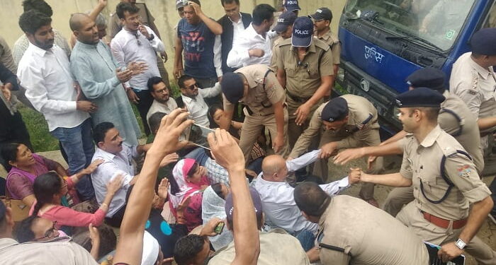 सामने पेश हुए । कुछ ही देर में सभी आंदोलनकारियों को पुलिस की बसों में बिठाया गया। इस दौरान स्थानीय और प्रदेश के विभिन्न क्षेत्रों से पहुंचे नेताओं, सामाजिक कार्यकर्ताओं ने विरोध में नारेबाजी करते हुए बस के आगे धरना प्रदर्शन और जोरदार नारे बाजी करते रहे। किसी तरह पुलिस ने घसीट घसीट कर आन्दोलनकारियों को किनारे कर बस आगे बढाई। इस दौरान उनके