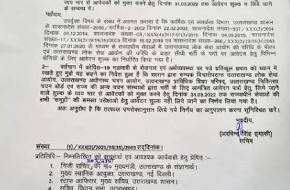 उत्तराखण्ड लोक सेवा आयोग, उत्तराखण्ड अधीनस्थ चयन आयोग, उत्तराखण्ड प्राविधिक शिक्षा परिषद्, उत्तराखण्ड चिकित्सा चयन बोर्ड एवं राज्य की अन्य चयन संस्थाओं द्वारा भर्ती के लिए आमंत्रित आवेदन पत्रों हेतु, लिये जाने वाले शुल्क से अब आवेदकों को राहत मिलेगी। आवेदकों से दिनांक 31 मार्च 2022 तक राज्याधीन सेवाओं की सभी “समूहों“ की समस्त परीक्षाओं हेतु आवेदन शुल्क नहीं लिया जायेगा।