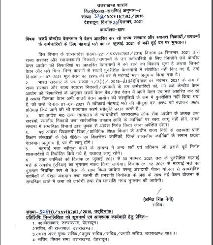 दूसरे आदेश के अनुसार केंद्रीय छठे वेतनमान में वेतन आहरित कर रहे राज्य सरकार एवं स्वायत्त निकायों/उपक्रमों के कर्मचारियों के लिए महंगाई भत्ते का 1 जुलाई 2021 से भुगतान किया जाएगा।