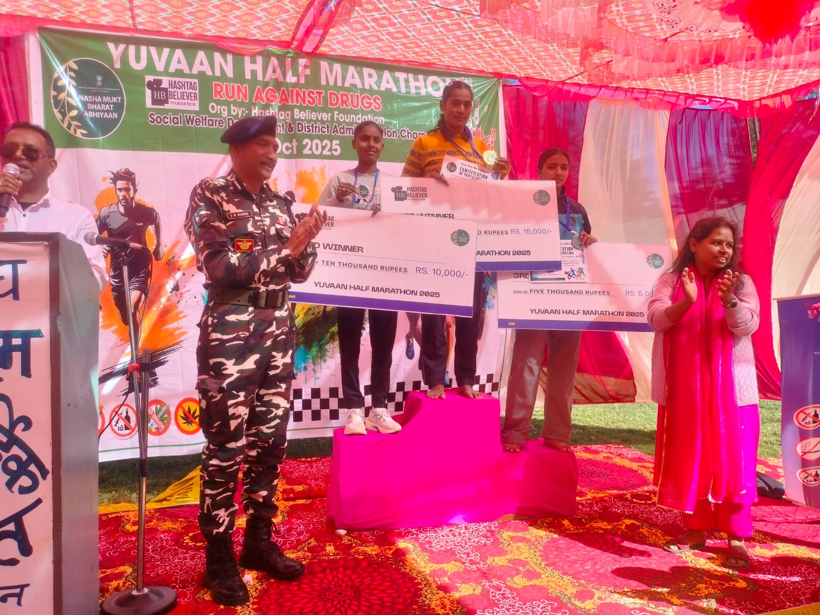 शुक्रवार को ग्वालदम से तलवाड़ी स्टेट एवं तलवाड़ी स्टेट से ग्वालदम के बीच 21.1 किमी लंबी हाफ मैराथन दौड़ का जिला प्रशासन, जिला समाज कल्याण विभाग एवं बिलीवर हेश टेक फाउंडेशन ने नशा मुक्ति अभियान के तहत हाफ मैराथन दौड़ का आयोजन किया गया।इस दौड़ को सुबह 9 बजे थराली विधायक भूपाल राम टम्टा व पूर्व विधायक कपकोट ललित फर्स्वाण ने हरी झंडी दिखाकर रवाना किया। 21.1 किमी दौड़ के 16 से 60 वर्ष वर्ग में चंपावत के विपिन पुत्र हेमचंद्र ने 1घंटा 5 मिनट दौड़ पूरी कर गोल्ड मेडल, गोपेश्वर के रोहित पुत्र विनोद सिंह ने 1 घंटा 6 मिनट में दौड़ पूरी कर सिल्वर मेडल एवं गोपेश्वर के ही विजय पुत्र देवेन्द्र सिंह ने 1 घंटा 8 मिनट में दौड़ पूरी कर ब्रोंज मेडल जीता। जबकि महिला वर्ग में हरिद्वार की रोबिन वर्मा पुत्री सिताब सिंह ने 1 घंटा 33 मिनट में दौड़ पूरी कर स्वर्ण पदक, हरिद्वार की ही पायल बालियान पुत्री मुकेश कुमार ने 1 घंटा 34 मिनट में दौड़ पूरी कर सिल्वर एवं अल्मोड़ा की दीपा मेहरा पुत्री मुकेश कुमार ने 1 घंटा 39 मिनट में दौड़ पूरी कर ब्रोंज मेडल जीता। गोल्डन, सिल्वर एवं ब्रोज मेडल विजेताओं को क्रमशः 15,10 व 5 हजार की नकद धनराशि के साथ ही एसएसबी ग्वालदम के डीआईजी बीएन भोम्बे ने बतौर पुरूस्कार समारोह के मुख्य अतिथि मेडल एवं प्रशस्ति पत्र सौंपे। दौड़ को हरी झंडी दिखाने से पूर्व आयोजित समारोह का दीप प्रज्वलित कर बतौर मुख्य अतिथि थराली विधायक भूपाल राम टम्टा ने कहा कि सरदार बल्लभभाई पटेल ने देश को जो मजबूती व एकजुटता का जो संदेश दिया वह आज भी पूरे भारत में कायम है। उन्होंने कहा कि आयोजित हो रही दौड़ केवल शारीरिक व्यायाम नही है बल्कि यह देश की एकता, अखंडता एवं नशें के खिलाफ एक मुहीम हैं। इस मौके पर उन्होंने उपस्थित लोगों को नशा ना करने की शपथ भी दिलाई। इस कार्यक्रम में ग्वालदम एवं तलवाड़ी क्षेत्र के स्कूली बच्चों, महिला मंगल दल,ग्राम पंचायत,व्यापार संघ ग्वालदम पूर्व सैनिक संगठन ग्वालदम, एसएसबी ग्वालदम ,प्रजापिता ब्रह्माकुमारी ईश्वरीय विश्वविद्यालय आदि ने सक्रिय भूमिका निभाई,इस मौके पर ग्वालदम क्षेत्र के विद्यालयों के छात्र-छात्राओं, महिला मंगल दल ग्वालदम ने रंगारंग सांस्कृतिक कार्यक्रम प्रस्तुत किए।कार्यक्रम का संचालन मनोज तिवारी ने किया इस अवसर पर बिलीवर हेश टेक की अध्यक्ष कंचन रावत, व्यापार संघ अध्यक्ष अनिल नेगी,प्रद्युम्न सिंह शाह, पर्वेंद्र भाकुनी, जिपंस कला देवी, क्षेपंस भावना रावत,मनमोहन चतुरा, कुलसारी भाजपा मंडल अध्यक्ष गिरीश चमोला, पूर्व जेष्ठ प्रमुख महावीर शाह, राजकीय महाविद्यालय तलवाड़ी की डॉ. प्रतिभा आर्य डॉ.प्रशांत रावत,इंद्र सिंह फर्स्वाण ,भगोत सिंह, सुजान सिंह, गोपाल सिंह फर्स्वाण,ग्वालदम की प्रधान ह