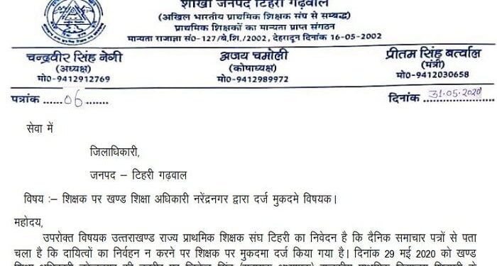 राजकीय प्राथमिक शिक्षक संगठन टिहरी गढ़वाल ने नरेंद्रनगर ब्लॉक में कार्यरत अध्यापक जितेंद्र सिंह के खिलाफ आपदा प्रबंधन एक्ट के अंतर्गत मुनी की रेती थाने में खंड शिक्षा अधिकारी नरेंद्रनगर द्वारा अभियोग दर्ज करने पर विरोध जताते हुए जिलाधिकारी से इसकी निष्पक्ष जांच की मांग की है।