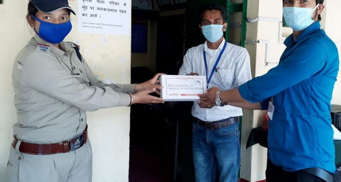 फोटो-कोतवाली जोशीमठ में होम्योपैथिक औषधि व सेनिटाइजर किट देते डा0अरूण कुमार व फार्मासिस्ट अरविंद ।