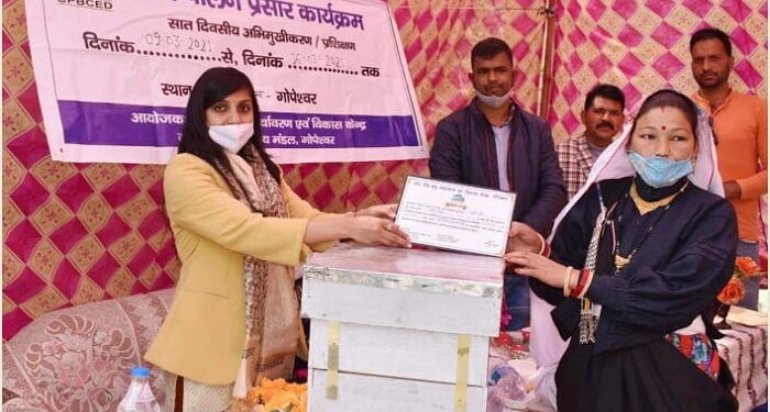 फोटो.मौन पालन प्रशिक्षण प्राप्त करने वालो को मौन पालन बॉक्स व प्रमाण पत्र देती डी एम।