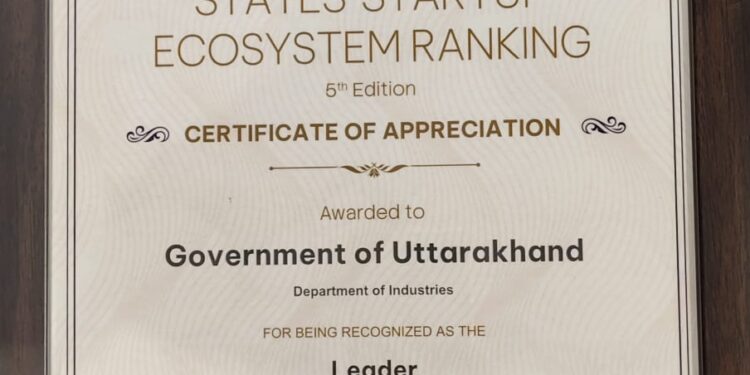 भारत सरकार के वाणिज्य एवं उद्योग मंत्रालय के अंतर्गत उद्योग संवर्धन एवं आंतरिक व्यापार विभाग (DPIIT) द्वारा जारी States’ Startup Ecosystem Ranking (5वां संस्करण) में उत्तराखण्ड को मजबूत स्टार्टअप इकोसिस्टम विकसित करने में ‘लीडर’ के रूप में मान्यता प्रदान की गई है। इस उपलब्धि के लिए राष्ट्रीय स्टार्टअप दिवस के अवसर पर उत्तराखण्ड सरकार के उद्योग विभाग को Certificate of Appreciation प्रदान किया गया।