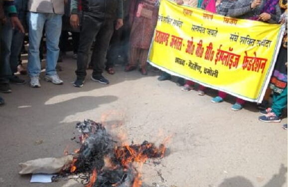 रूद्र प्रयाग के विधायक भरत चौधरी के कर्मचारियों को कथित तौर पर अपशब्द कहे जाने पर कर्मचारी संगठन द्वारा नगर के मुख्य तिराहे पर पुुतला दहन किया गया। कर्मचारियों ने कहा कि भरत चौधरी शीघ्र अपशब्दों के प्रयोग किये जाने के लिए माफी मांगे। इस दौौरान संगठन के अध्यक्ष नरेंद्र रावत ने कहा कि राइका गैरसैंण के खेल मैदान में चल रहा धरना अब रामलीला मैदान गैरसैंण में किया जायेगा। रैली और धरना प्रदर्शन में शिक्षा, स्वास्थ्य, ग्राम्य विकास, पंचायतीराज, पशुपालन, लोनिवि, कृषि, वन कोषागार आदि विभागों के संगठन संयोजक मोहन सिंह रावत, अध्यक्ष नरेंद्र रावत, महामंत्री राकेश सजवान, पुष्पा रतूड़ी, श्याम सिंह रावत, दिनेश काला, दिगंबर नेगी, मुकेश नेगी, दिगंबर गैड़ी, मनोज शाह, जगदीश रावत, भरत नेगी, सरोजनी काला, इंदू पुरोहित, प्रभा नेगी, ज्योति गैरोला, प्रभा गौड़, लक्ष्मी नेगी, उमेश पंवार, विनोद गौड़, रणबीर फस्वार्ण, अमरसिंह, कुुंवरसिंह रावत आदि मौजूद रहे।