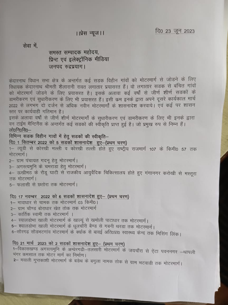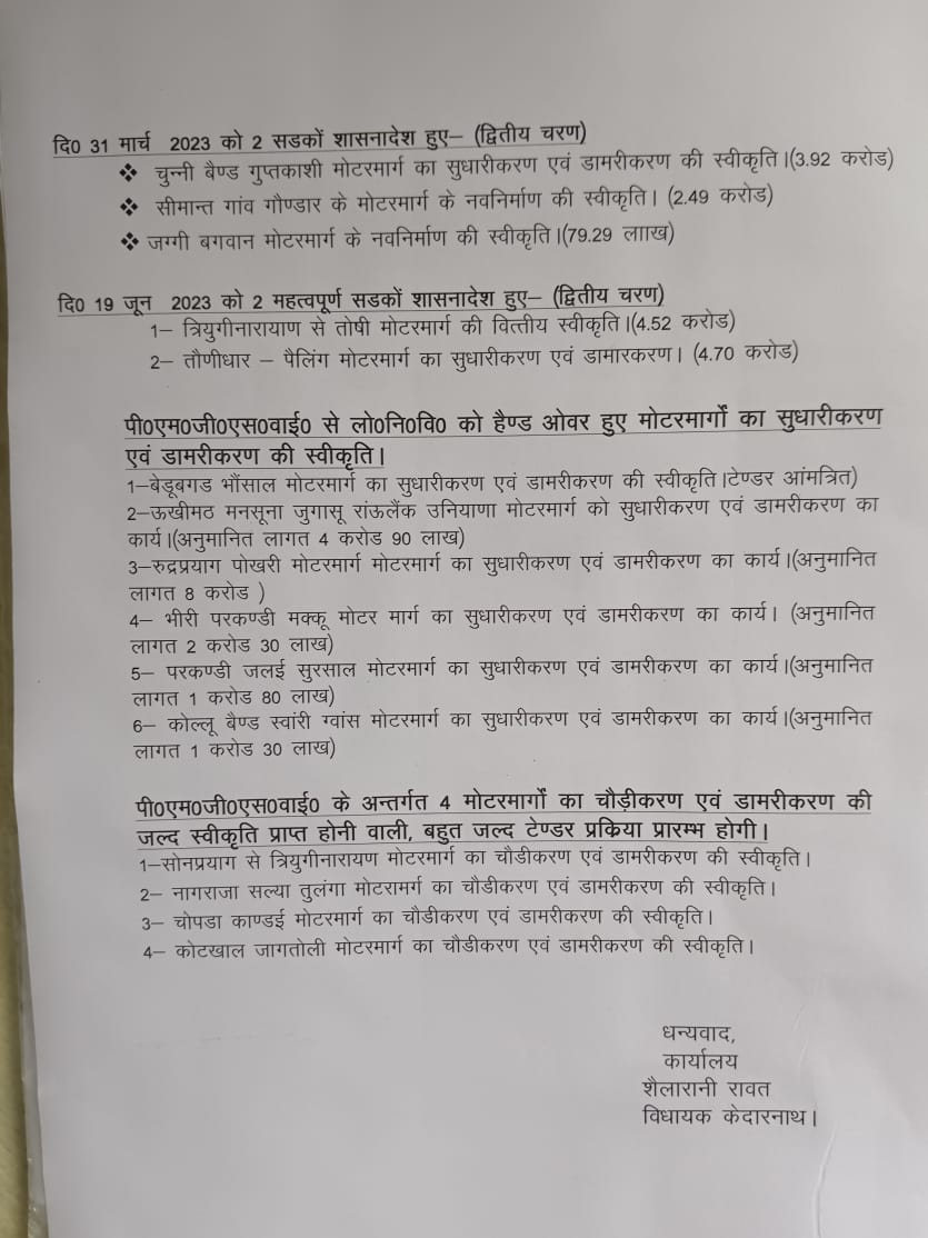 केदारनाथ विधायक ने कहा कि एक वर्ष के कार्यकाल में 2 दर्जन से अधिक सड़को की स्वीकृति जनता के सहयोग से दिलवाई है,जबकि कई सडके स्वीकृति के लिए प्रस्तावित है। जिनमें पीडब्लूडी एंव पीएमजीएसवाई विभागों से संबंधित है। विधायक शैलारानी रावत ने कहा कि जल्द ही जनता को यातायात सुविधा का लाभ मिलेगा साथ ही केदारनाथ विधानसभा को आदर्श विधानसभा बनाने का प्रयास किया जा रहा है.उन्होंने सभी क्षेत्रीय जनता की और से सरकार का धन्यवाद किया।