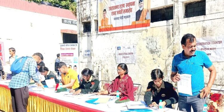 कोटद्वार। डॉ० पीतांबर दत्त बड़थ्वाल हिमालयन राजकीय स्नातकोत्तर महाविद्यालय कोटद्वार में जिला स्तरीय रोजगार मेले का आयोजन जिला प्रशासन पौड़ी जनपद के तत्वावधान में सेवायोजन कार्यालय लैंसडाउन द्वारा किया गया। कार्यक्रम का शुभारंभ मुख्य अतिथि उत्तराखंड राज्य विधानसभा अध्यक्ष एवं विधायक कोटद्वार रितु खंडूड़ी भूषण द्वारा दीप प्रज्वलित कर किया गया। मुख्य अतिथि का स्वागत प्राचार्य प्रोफेसर डी.एस. नेगी एवं जिला विकास अधिकारी गिरीश गुणवंत ने पुष्प गुच्छ और शॉल भेंट करके किया। अपने संबोधन में श्रीमती रितु खंडूरी भूषण ने सर्वप्रथम उत्तराखंड निर्माण के राज्य आंदोलनकारियों के बलिदान को नमन करते हुए इस रजत जयंती के अवसर पर राज्य के सर्वांगीण विकास के लिए सरकार की प्रतिबद्धता जतायी और राज्य के विकास और उत्थान के लिए स्वरोजगार को बढ़ावा दिए जाने को महत्वपूर्ण बताया। उत्तराखंड में रोजगार सृजन एवं पलायन पर रोक को उन्होंने सरकार की मुख्य प्राथमिकता बताया इस अवसर पर स्वरोजगार के लिए विभिन्न योजनाओं के तहत लाभार्थियों को चेक भेंट किया गए। कार्यक्रम का संचालन प्रोफेसर रमेश चौहान द्वारा सफलतापूर्वक किया गया तथा महाविद्यालय के प्राचार्य प्रोफेसर डी.एस. नेगी द्वारा धन्यवाद व्यापित किया गया। तत्पश्चात रोजगार मेले का प्रारंभ हुआ। इस मेले में सेवायोजन लैंसडाउन श्रम विभाग लीड बैंक परिवहन कृषि उद्योग एवं निर्वाचन विभाग के विभिन्न स्टॉल लगाए गये थे। मुख्य सेवायोजन अधिकारी लैंसडाउन उत्तम कुमार के पर्यवेक्षण और मार्गदर्शन में विभिन्न क्षेत्रों की कुल 27 कंपनियों ने बेरोजगार युवाओं को पंजीकृत कर मार्गदर्शन किया। पूरे जनपद के कुल 325 अभ्यर्थियों द्वारा पंजीकरण करवा कर रोजगार मेले का लाभ लिया गया। इस सम्पूर्ण कार्यक्रम के सफल आयोजन में राजकीय स्नातकोत्तर महाविद्यालय कोटद्वार की कैरियर काउंसलिंग एवं प्लेसमेंट सेल की संयोजिका डॉ० ऋचा जैन तथा समस्त सदस्यों, महाविद्यालय के समस्त प्राध्यापकों एवं शिक्षणेत्तर कर्मचारियों तथा छात्र संघ के पदाधिकारियों ने सक्रिय सहयोग दिया।
