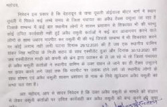 देहरादून। जिला पंंचायत का दुधली, डोईवाला में अवैध टेक्स वसूली के संबंध में स्थानीय निवासियों ने नवक्रान्ति संगठन कार्यकर्ताओं के नेतृत्व में जिलाधिकारी देहरादून को अवैध टैक्स को तत्काल बन्द करने एव अवैध टेक्स वसूली करने वालों के विरुद्ध उचित कार्यवाही करने की मांग की है।