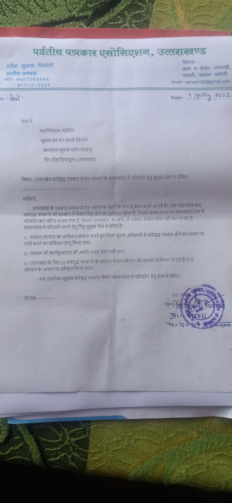 वयोवृद्ध पत्रकारों के पेंशन योजना में सरलीकरण किए जाने की मांग को लेकर पर्वतीय पत्रकार एसोसिएशन ने महानिदेशक सूचना एवं जनसंपर्क विभाग को एक ज्ञापन भेजा है।