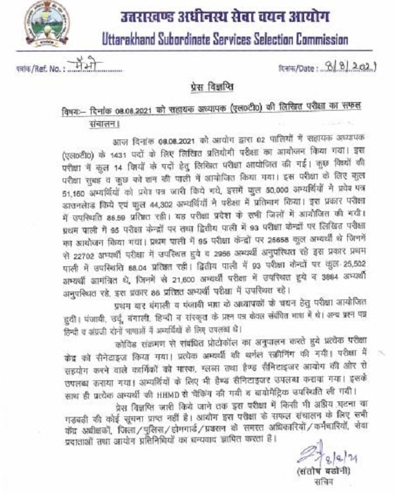 देहरादून। अधीनस्थ सेवा चयन आयोग द्वारा आयोजित सहायक अध्यापक, एलटी की 1431 पदों पर भर्ती परीक्षा संपन्न हो गई। यह परीक्षा राज्य में 95 परीक्षा केंद्रों पर संपन्न हुई।