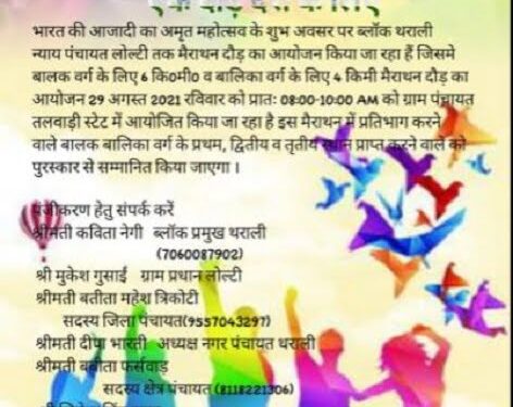 भारत की आजादी के तहत अमृत महोत्सव के अवसर पर विकासखंड थराली के न्याय पंचायत लोल्टी के अंतर्गत ग्राम पंचायत तलवाड़ी स्टेट में नेहरू युवा केंद्र चमोली के द्वारा रविवार को मैराथन दौड़ का आयोजन किया जाएगा।