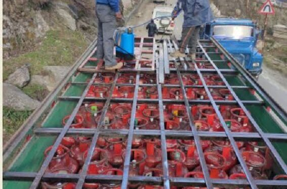 फोटोः रसोई गैस सिलेंडर वितरण से पूर्व छिड़काव करते पालिका कर्मी