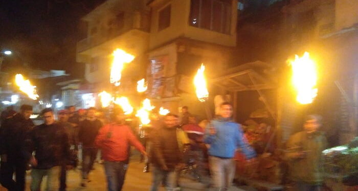 मशाल जुलूस जीआईसी चैक से शुरू हुआ और जोरदार नारेबाजी करते हुए कामेट तिराहे पर समाप्त हुआ। मशाल जुलूस मे शामिल आंदोलनकारी सरकार के विरोध मे जर्बदस्त नारेबजी कर रहे थे।