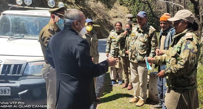 डी एफ ओ किसन चंद ने सभी वन कर्मियों से अपनी सुरक्षा के साथ वन व वन्य प्राणियों की रक्षा करने का आव्हान किया। श्री किसन चंद ने सभी फील्ड कर्मचारियों को लॉक डाउन के दौरान राशन व अन्य जरूरी चीजों की आवश्यकता होने पर सभी कार्मिकों को तैनाती स्थलों पर ही सभी जरूरी चीजें उपलब्ध कराई जायेगी। सेनिटाइजर व मास्क वितरण के दौरान रेंज आफिसर जोशीमठ द धीरेश बिष्ट व रेंज आफिसर फूलों की घाटी रेंज बृज मोहन भारती भी मौजूद रहे।
