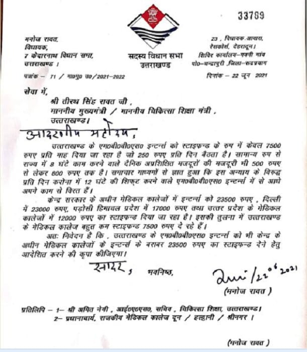 केदारनाथ विधायक मनोज रावत ने उत्तराखण्ड सरकार के मुखिया को भेजे पत्र के माध्यम से एमबीबीएस इंटर्न को मिलने वाले स्टाईफण्ड पर सवाल उठाया है। उन्होंने कहा है कि प्रशिक्षित एमबीबीएस डाक्टर इंटर्नशिप के दौरान दैनिक अप्रशिक्षित मजदूर से भी कम दिहाड़ी देकर डाक्टर पेशे का अपमान नहीं कर रही है?