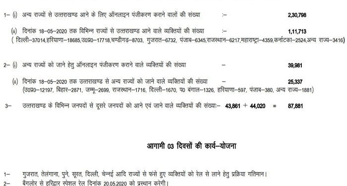 उत्तराखंड से अन्य राज्यों को जाने के लिए 39981 लोग आन लाइन पंजीकरण करा चुके हैं। 25337 लोग अपने-अपने प्रदेशों को जा चुके हैं। जबकि 87881 लोग राज्य के अंदर ही एक जनपद से दूसरे जनपदों में जा चुके हैं।