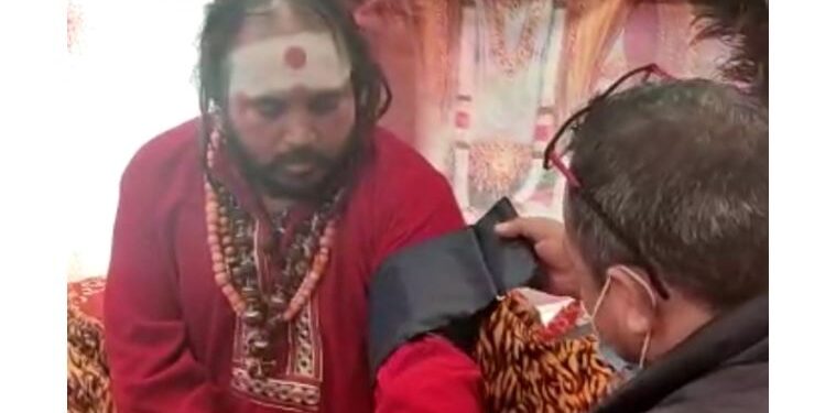 फोटो- आमरण अनशन पर बैठे मौनी बाबा को स्वास्थ्य परीक्षण करते चिकित्साधिकारी।