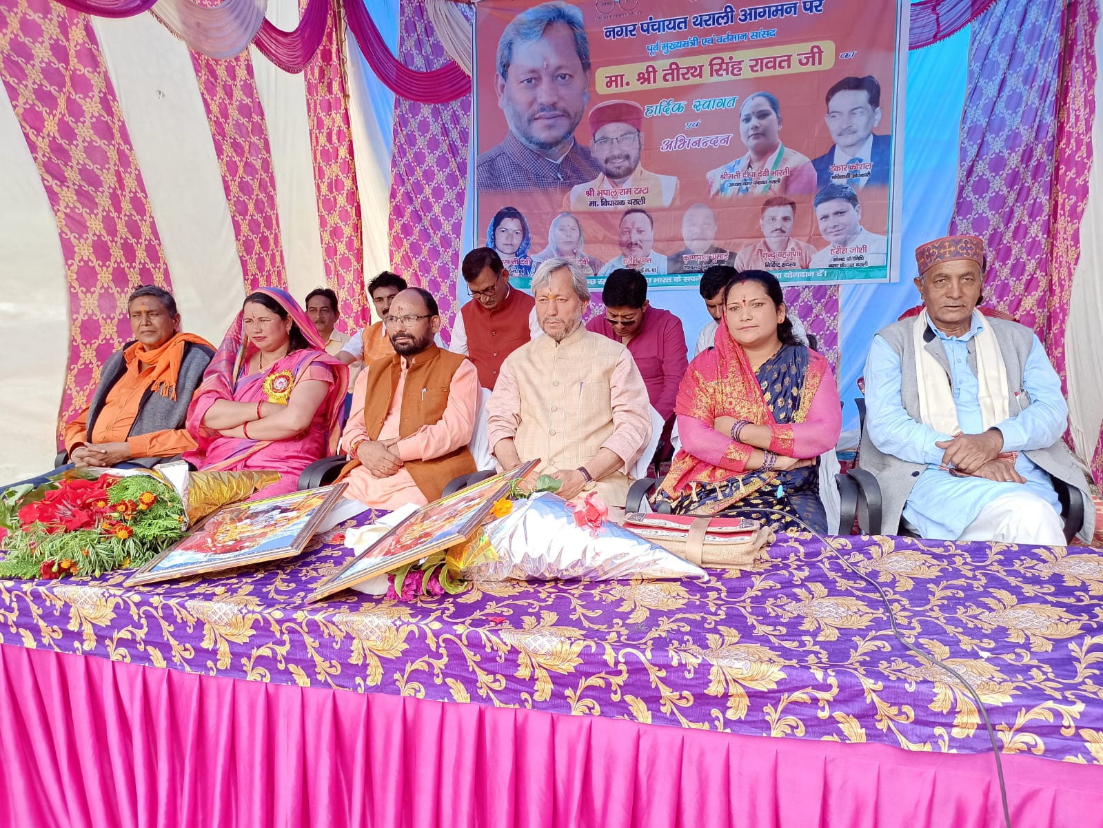 इस अवसर पर थराली प्रमुख कविता नेगी, जिपंस देवी जोशी, भाजपा मंडल अध्यक्ष रणजीत नेगी, महामंत्री गिरीश चमोला, नगर पंचायत के पार्षद कृष्णपाल गुसाईं, सीमा देवी, पूर्व प्रदेश उपाध्यक्ष नरेंद्र भारती, कर्नल हरेंद्र रावत, राकेश भारद्वाज, नंदू बहुगुणा, राकेश भारद्वाज, युवा मोर्चा के जिलाध्यक्ष देवेंद्र नेगी, उपाध्यक्ष अनिल देवराड़ी, जितेंद्र बिष्ट, भाष्कर पांडे, गंगा बिष्ट, केडी जोशी आदि ने सांसद एवं विधायक का फूलमालाओं एवं गाजे.बाजों के साथ भव्य स्वागत किया। इस अवसर पर एसडीएम रविंद्र जुंवाठ़ा, थाना प्रभारी बृजमोहन सिंह राणा, नगर पंचायत के ईओं टंकार कौशल आदि ने पूर्व सीएम की अगवानी की। इस मौके पर स्थानीय लोगों ने फूल मालाओं एवं ढ़ोल नगाड़ों के साथ सांसद एवं विधायक का भव्य रूप से स्वागत किया।